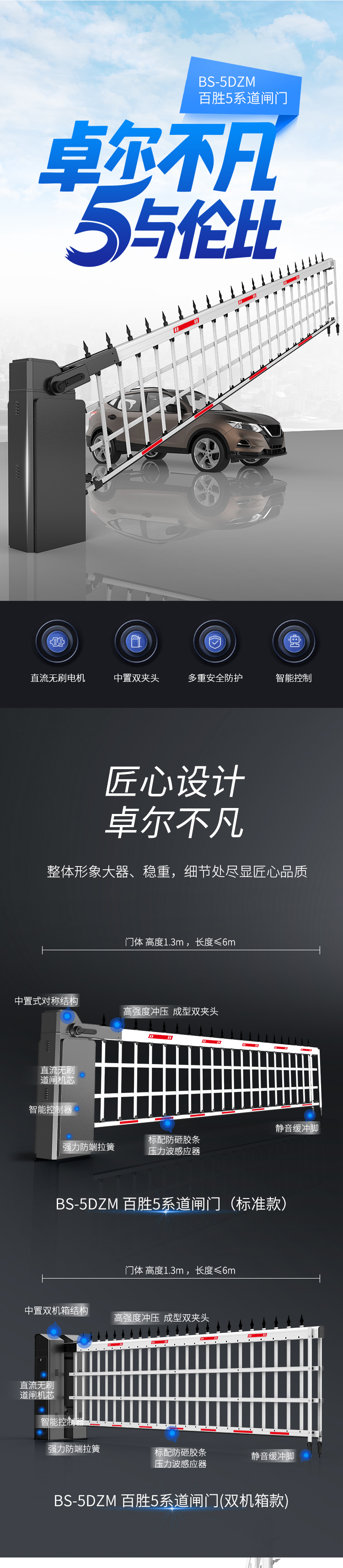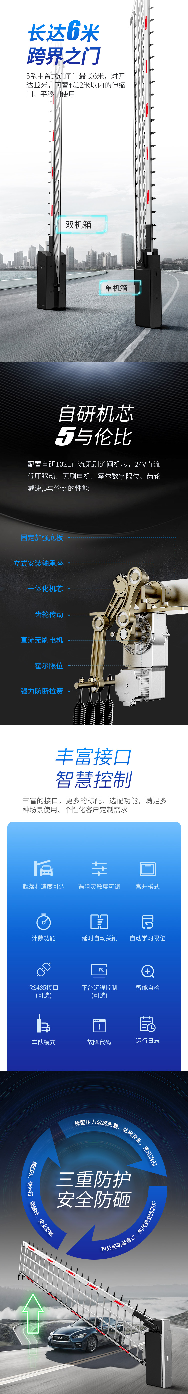 5系中置式道閘門最長6米,對開達12米,可替代12米以內(nèi)的伸縮門、平移門使用